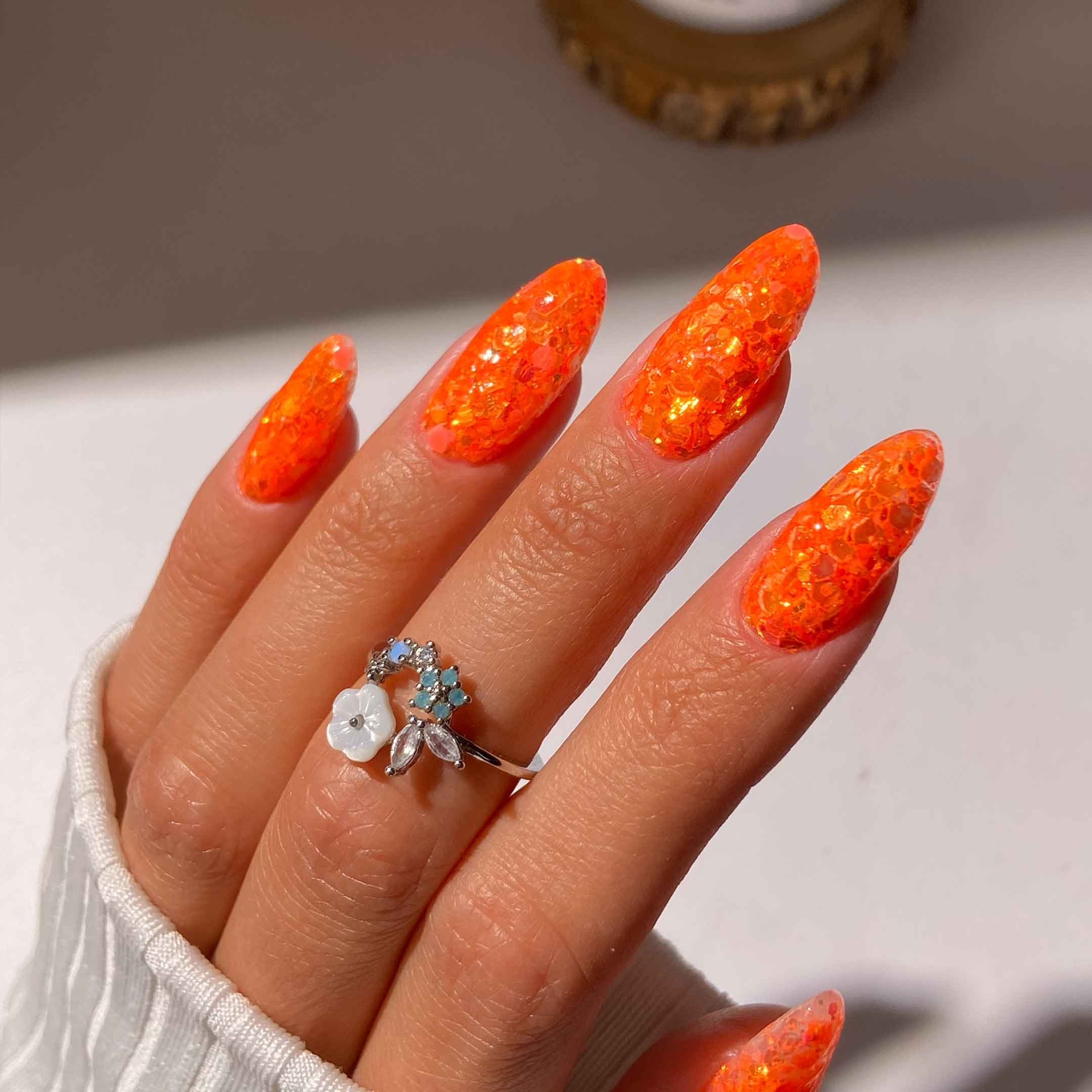 Juicy is a mouth-watering bright orange featuring a stunning mix of light-catching flakes for a high-shine finish. It's the perfect bold shade for a fun and energetic summer vibe