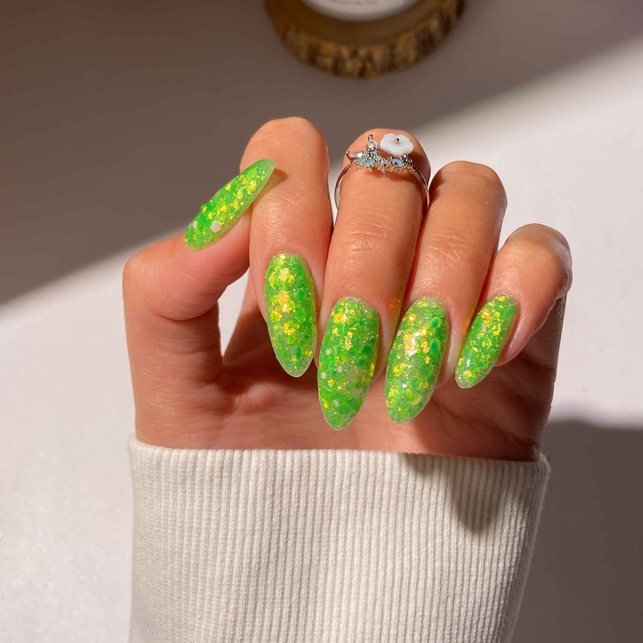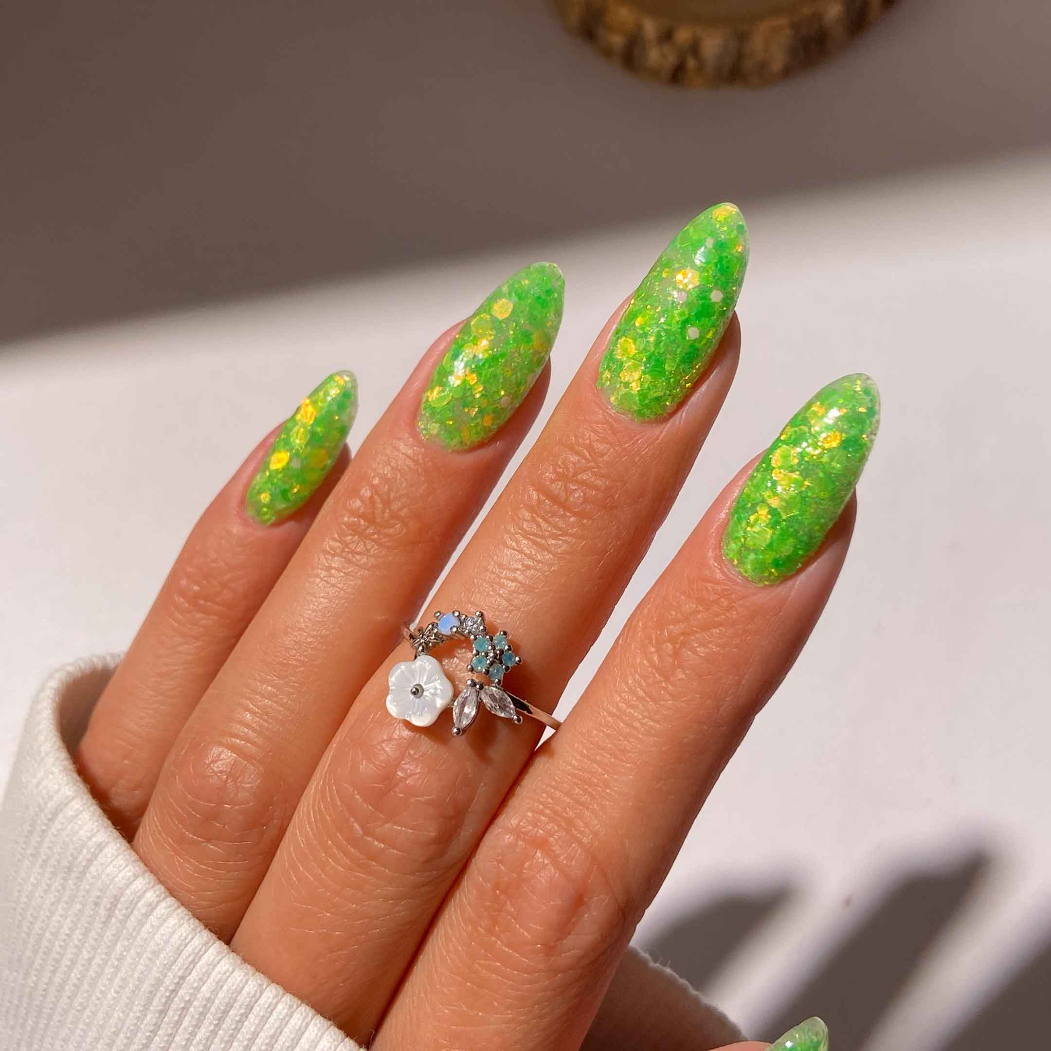 Add a refreshing pop of colour to your look with Zest. This vibrant, lime green is the ultimate statement shade, featuring light-catching flakes to brighten up your mood and your manicure